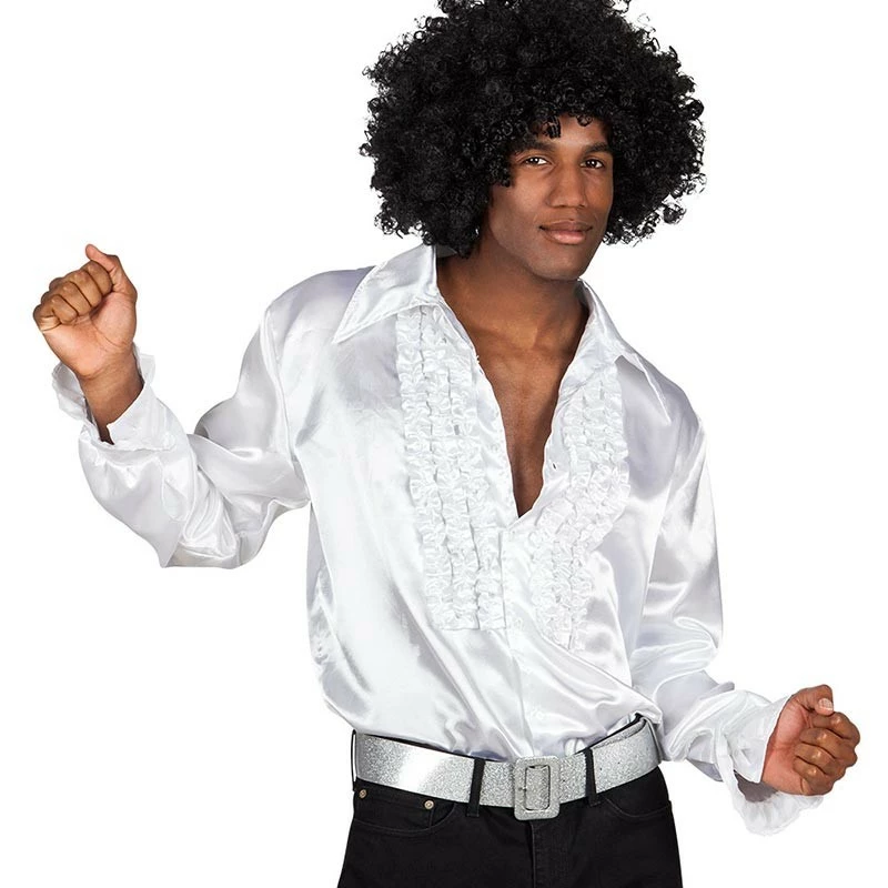 Ce modèle de chemise existe également en or, rose, argent, noir, rouge, bleu et arc-en-ciel. Pour compléter votre tenue disco, nous vous conseillons le pantalon à pattes d’eph et dans l’idéal des chaussures à talons, ce modèle était très à la mode dans les années 1970.