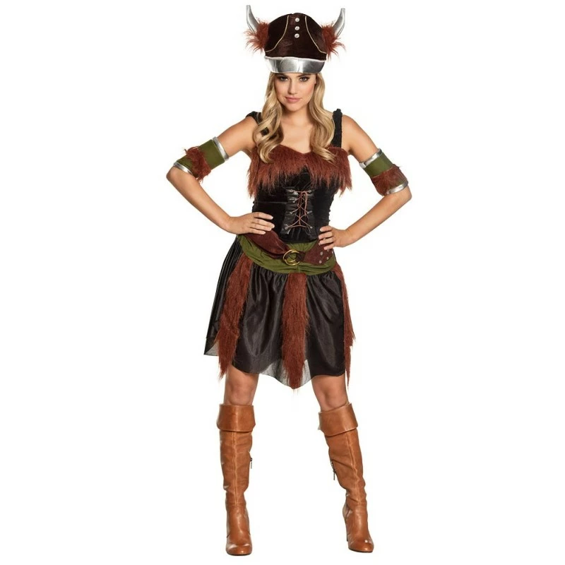 Pour rendre ce déguisement femme viking encore plus réaliste, n’hésitez pas à l’accessoiriser avec du maquillage de guerrière noir, marron ou vert, du faux sang, une hache, un bouclier, une épée, une corne de brume, une perruque ou encore de grandes bottes marron ou noires.
